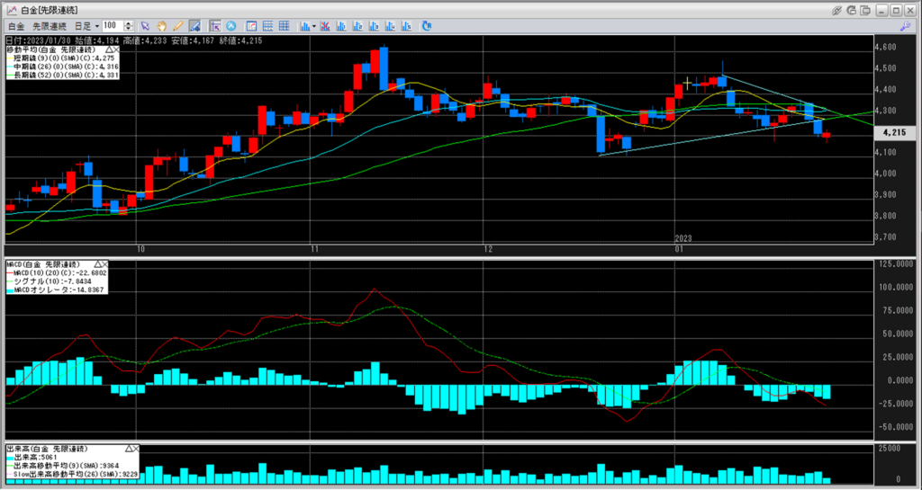 白金のチャートを見ると、4,250円から4,500円のボックス圏相場を