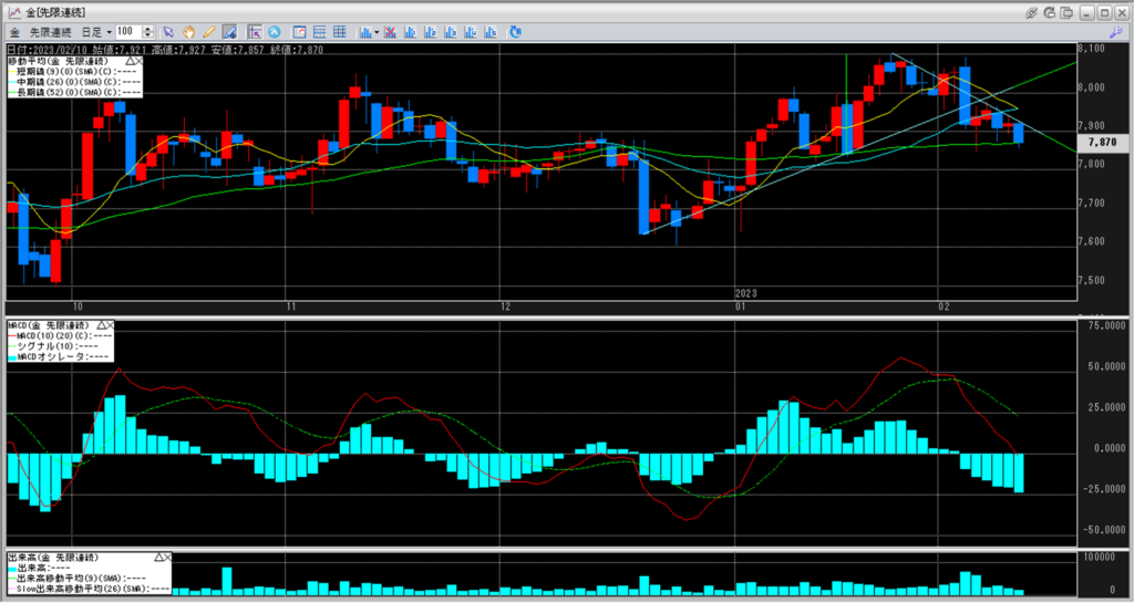 金のチャートをみると、7,900円を下回り、長期線も割れそうになってきています。