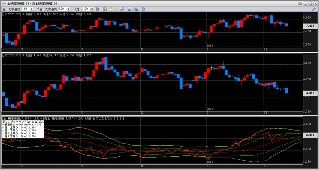 金白金の鞘をボリンジャーバンドで見ていきます。