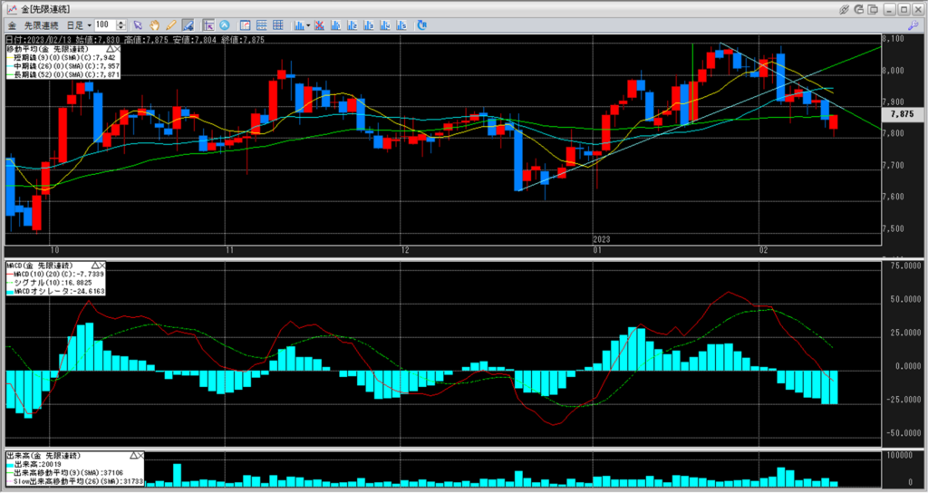金のチャートをみると、7,900円を下回り、長期線も僅かながら割れています。