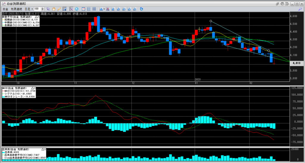 白金のチャートを見ると、4,250円から4,500円のボックス圏相場を