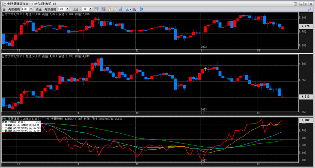 下記に金白金鞘の移動平均線のチャートを貼り付けています。