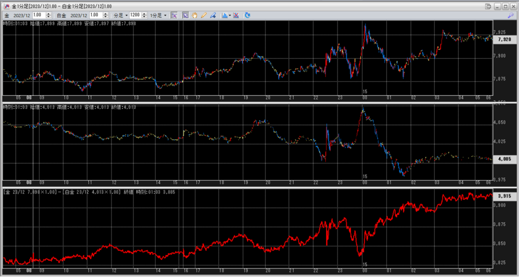 どこかで鞘拡大の仕掛金買い1枚-白金売り2枚を建てていければと考えています。