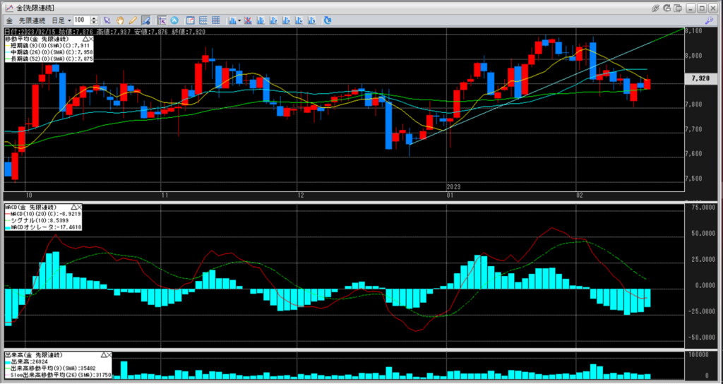 金のチャートをみると、7,900円を上回り、短期線を超えてきています。
