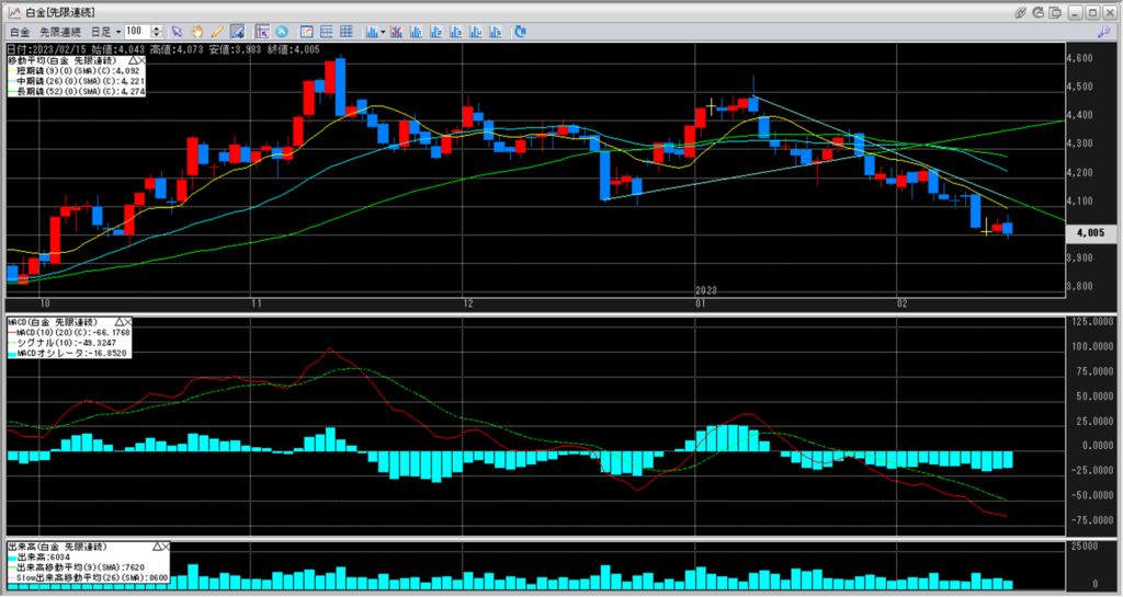 白金のチャートを見ると、4,250円から4,500円のボックス圏相場を