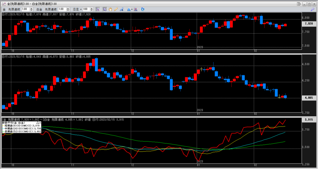 下記に金白金鞘の移動平均線のチャートを貼り付けています。