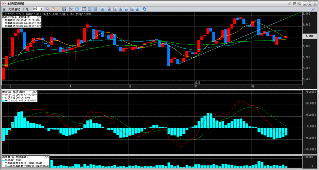 金のチャートをみると、7,900円を上回り、短期線をギリギリ超えています。
