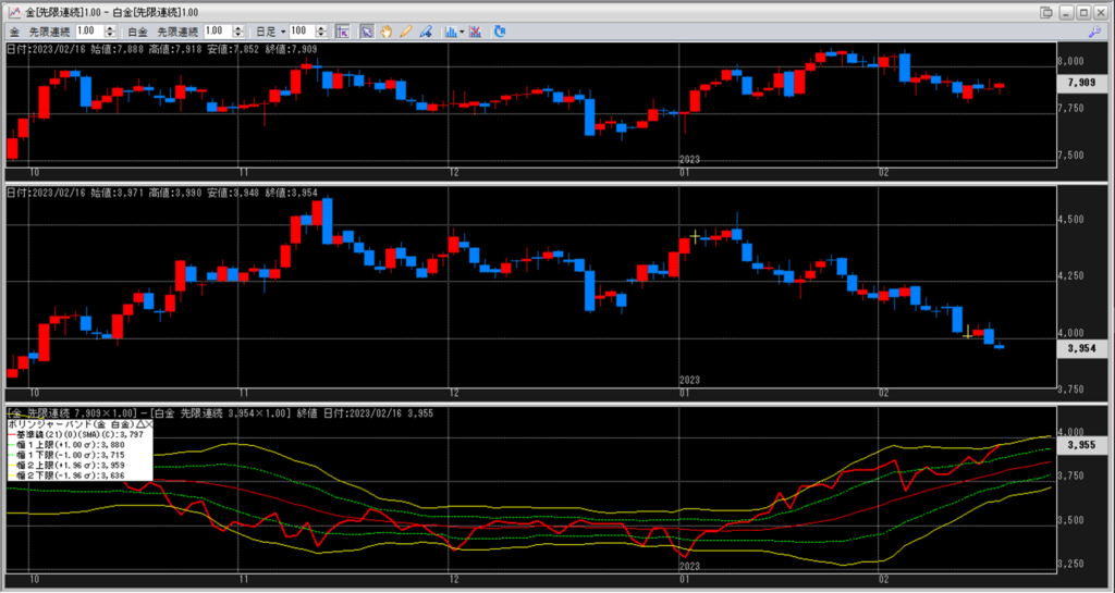 金白金の鞘をボリンジャーバンドで見ていきます。
