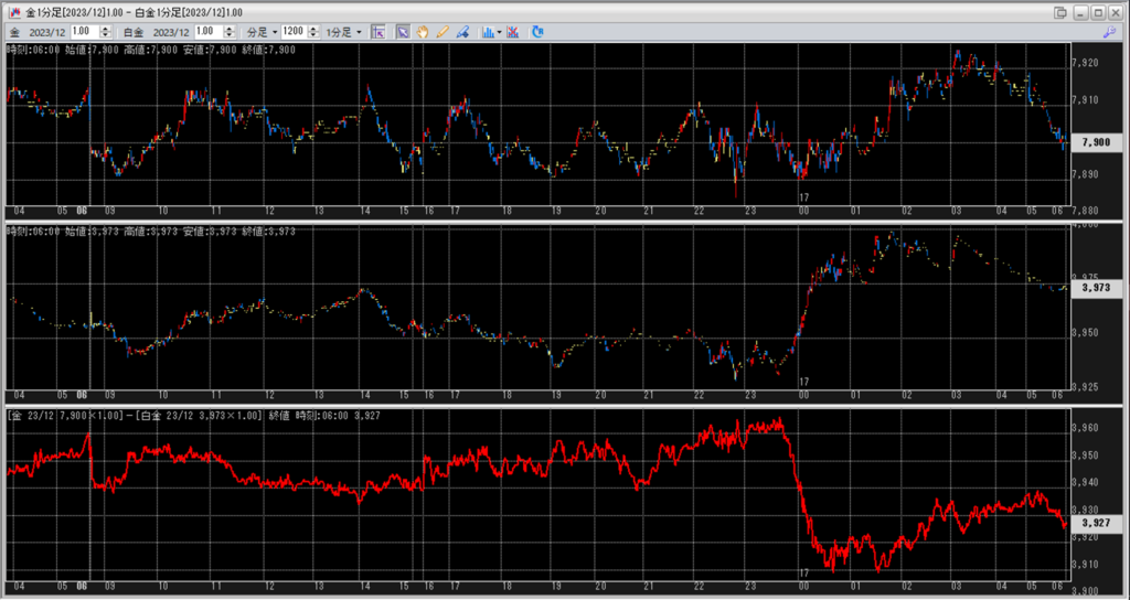 どこかで鞘拡大の仕掛金買い1枚-白金売り2枚を建てていければと考えています。