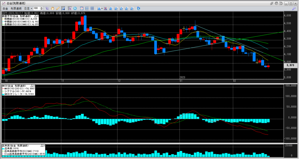 白金のチャートを見ると、4,250円から4,500円のボックス圏相場を