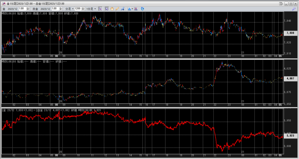 建玉としましては、鞘拡大の仕掛け金買い1枚-白金売り2枚を1組を保持しています。