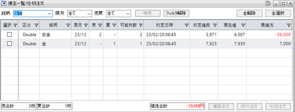 現在、鞘拡大の仕掛金買い1枚-白金売り2枚を1組、保持しています。