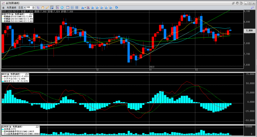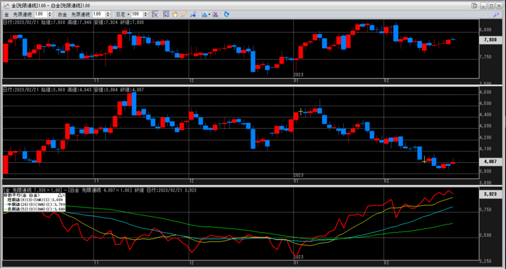 下記に金白金鞘の移動平均線のチャートを貼り付けています。
