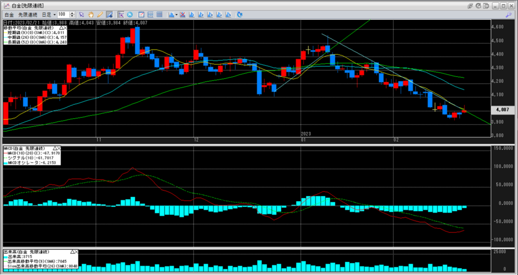 白金のチャートを見ると、4,250円から4,500円のボックス圏相場を