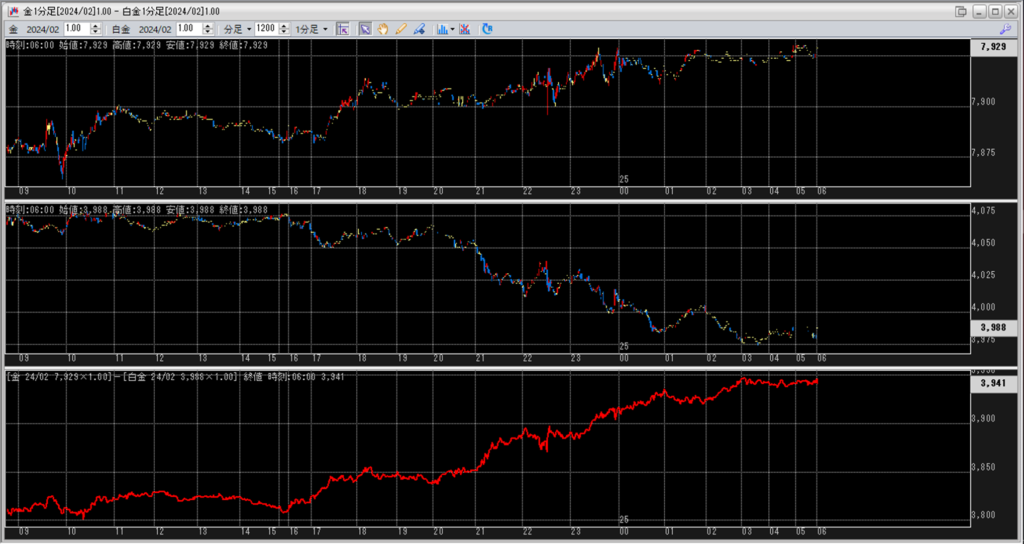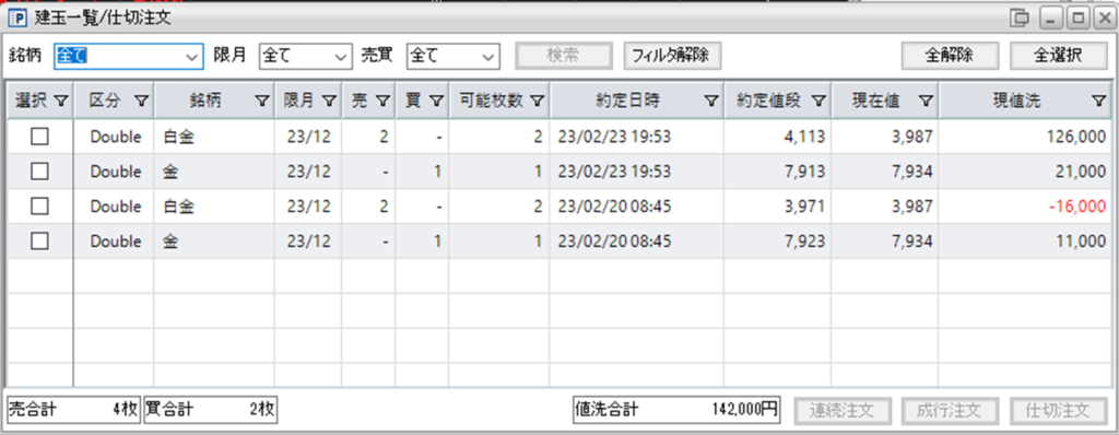 現在、鞘拡大の仕掛金買い1枚-白金売り2枚を2組、保持しています。