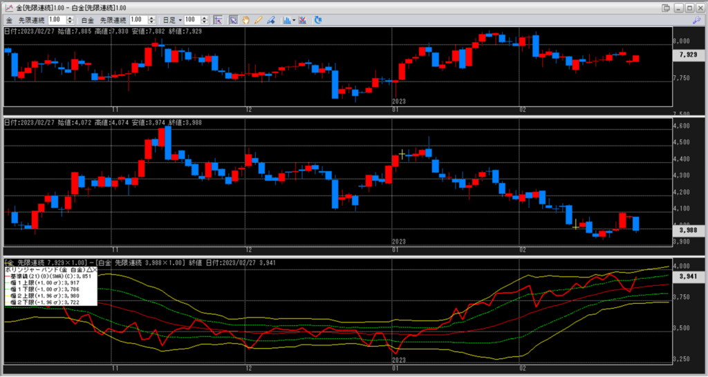 金白金の鞘をボリンジャーバンドで見ていきます。