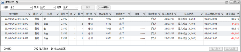 昨日、鞘拡大の仕掛金買い1枚-白金売り2枚の2組を利確しています。