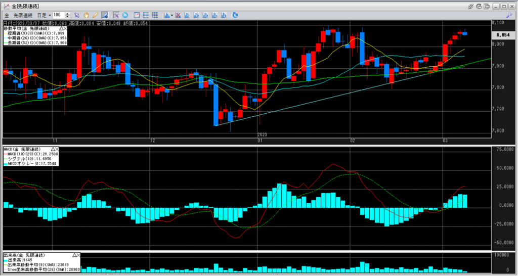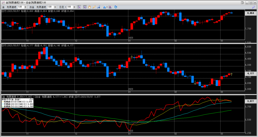 下記に金白金鞘の移動平均線のチャートを貼り付けています。