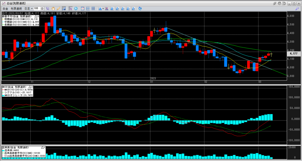 白金のチャートを見ると、4,250円から4,500円のボックス圏相場を