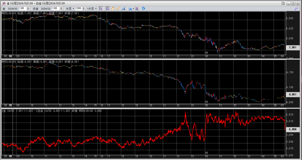 新規に鞘拡大の仕掛金買い1枚-白金売り2枚を建てようと思っていましたが、