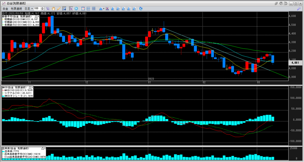 白金のチャートを見ると、4,250円から4,500円のボックス圏相場を