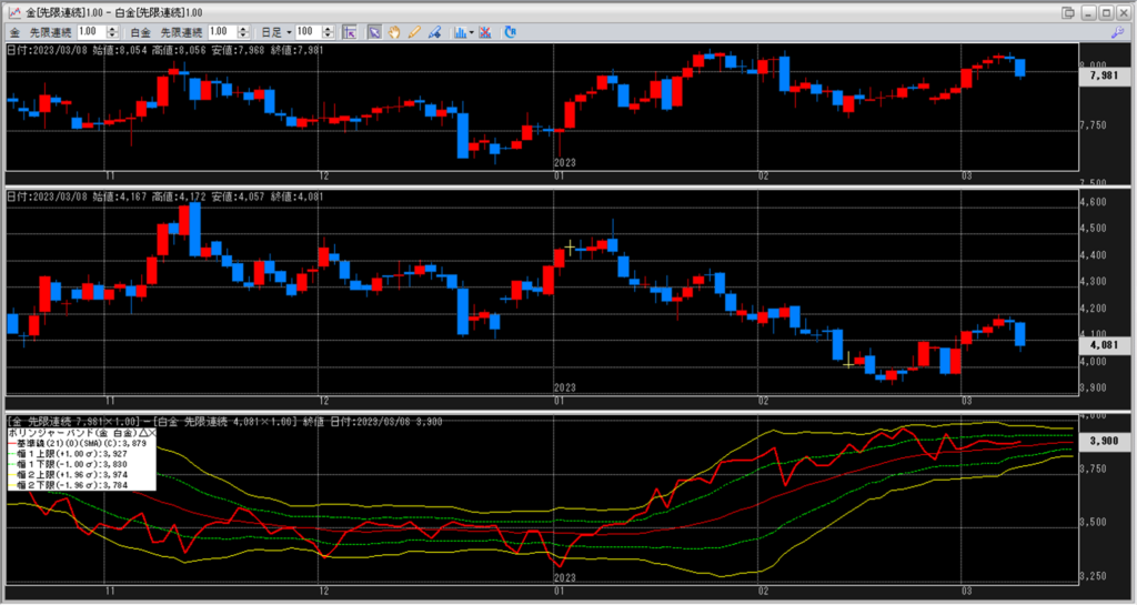 金白金の鞘をボリンジャーバンドで見ていきます。