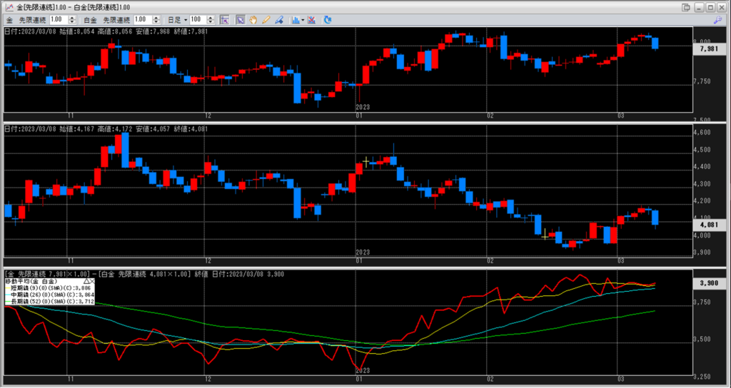 下記に金白金鞘の移動平均線のチャートを貼り付けています。