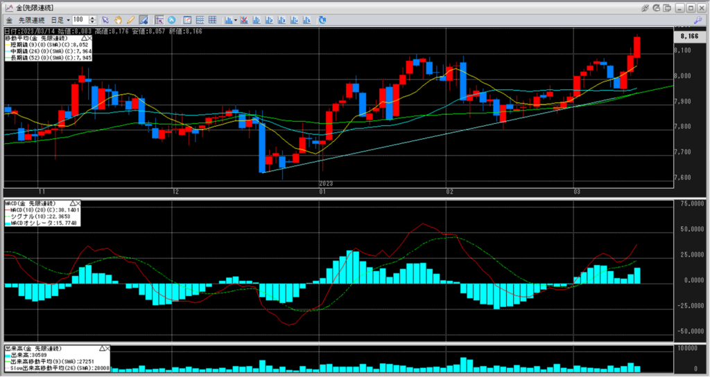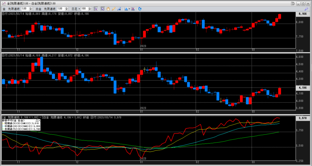 下記に金白金鞘の移動平均線のチャートを貼り付けています。