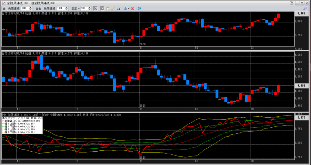 金白金の鞘をボリンジャーバンドで見ていきます。
