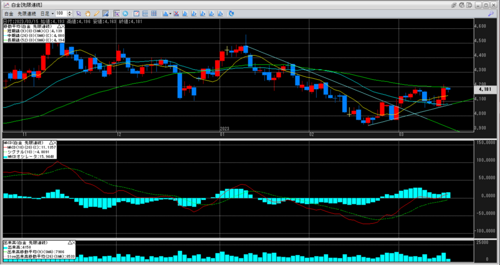 白金のチャートを見ると、4,250円から4,500円のボックス圏相場を