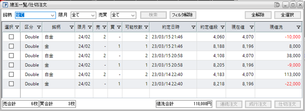 併せて、鞘拡大の仕掛金買い1枚-白金売り2枚を1組、デイトレとなっております。
