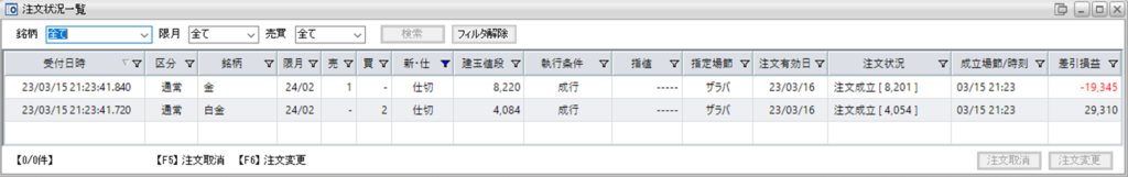 新規で鞘拡大の仕掛金買い1枚-白金売り2枚を2組を追加し、