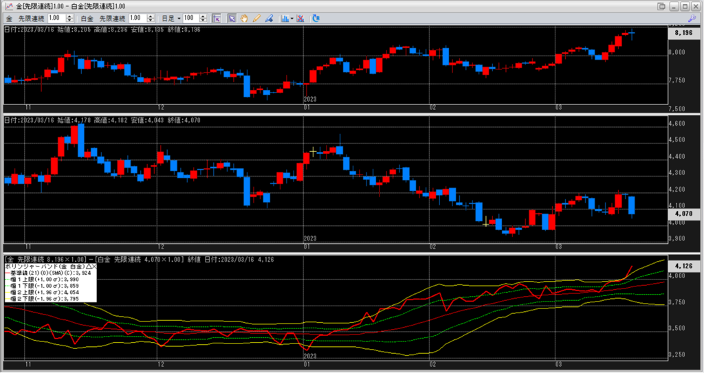 金白金の鞘をボリンジャーバンドで見ていきます。