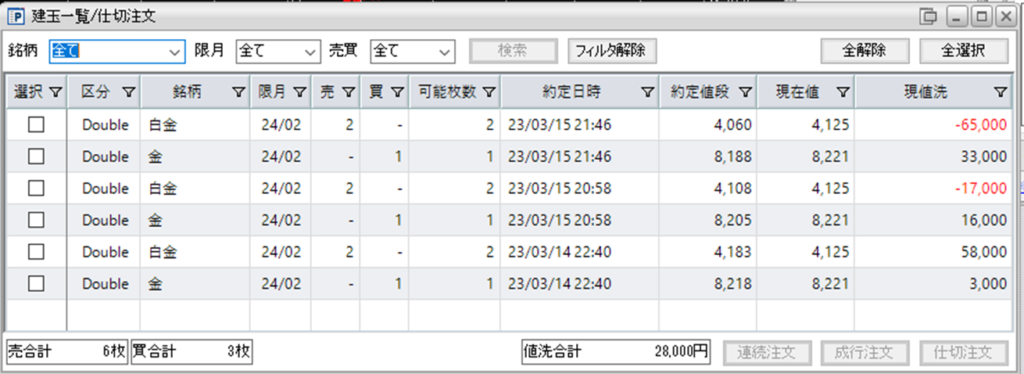 鞘拡大の仕掛金買い1枚-白金売り2枚を3組、保持しています。
