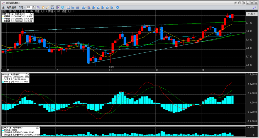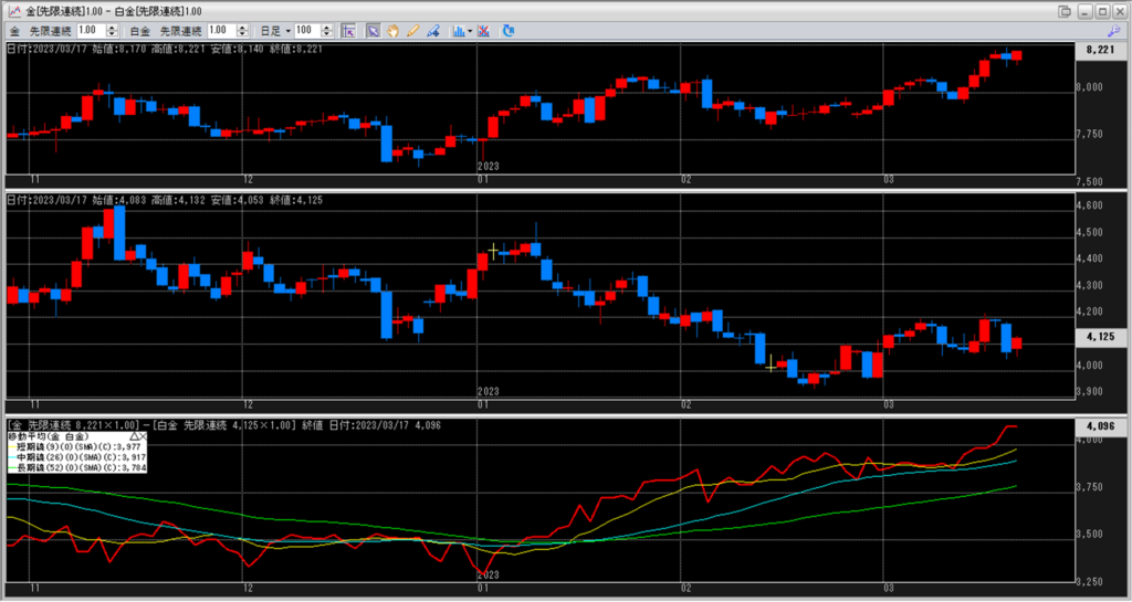 下記に金白金鞘の移動平均線のチャートを貼り付けています。