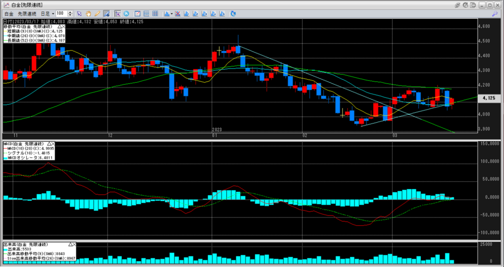 白金のチャートを見ると、4,250円から4,500円のボックス圏相場を