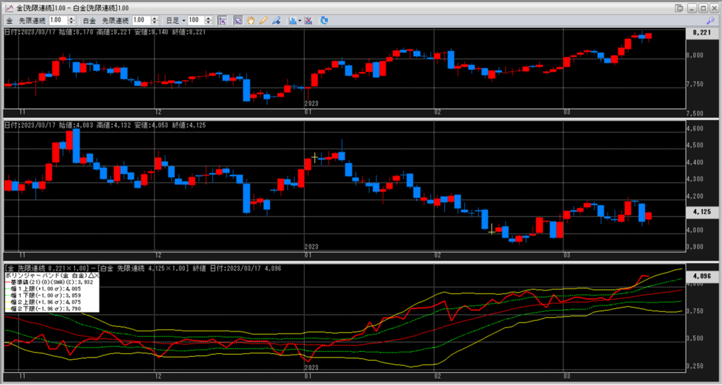 金白金の鞘をボリンジャーバンドで見ていきます。
