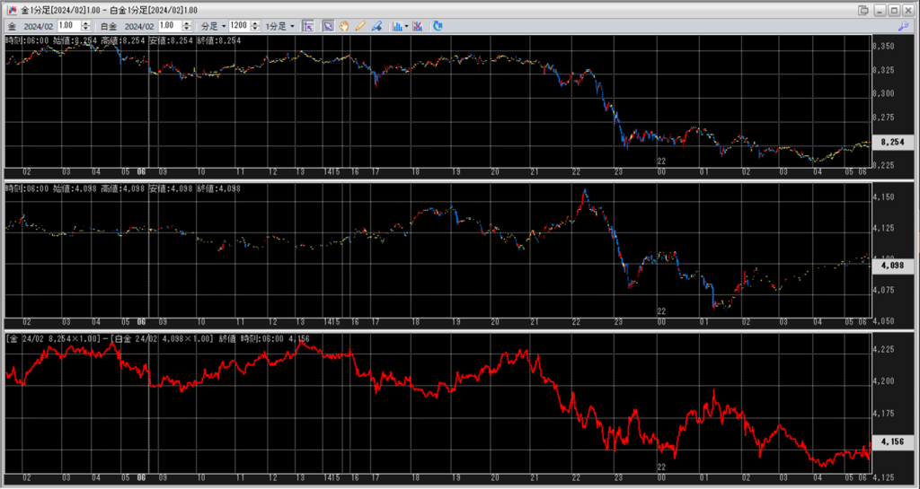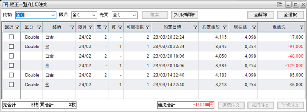 現在、鞘拡大の仕掛金買い1枚-白金売り2枚を3組、保持しています。