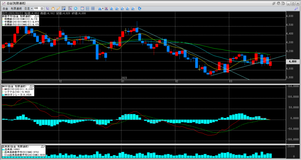 白金のチャートを見ると、4,250円から4,500円のボックス圏相場を