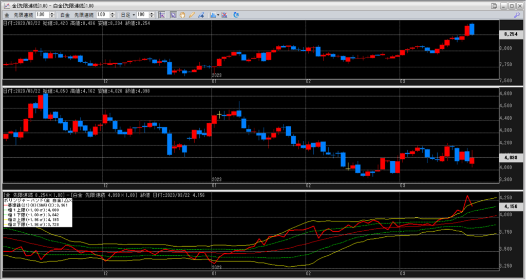 金白金の鞘をボリンジャーバンドで見ていきます。