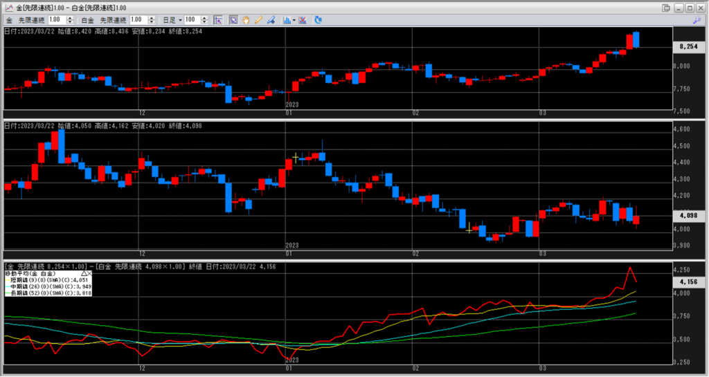 下記に金白金鞘の移動平均線のチャートを貼り付けています。
