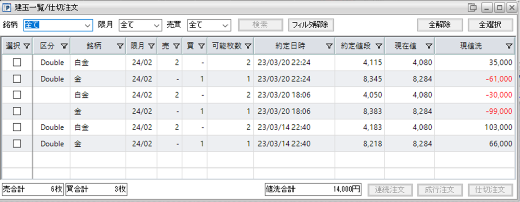 保持している鞘拡大の仕掛金買い1枚-白金売りの3組は