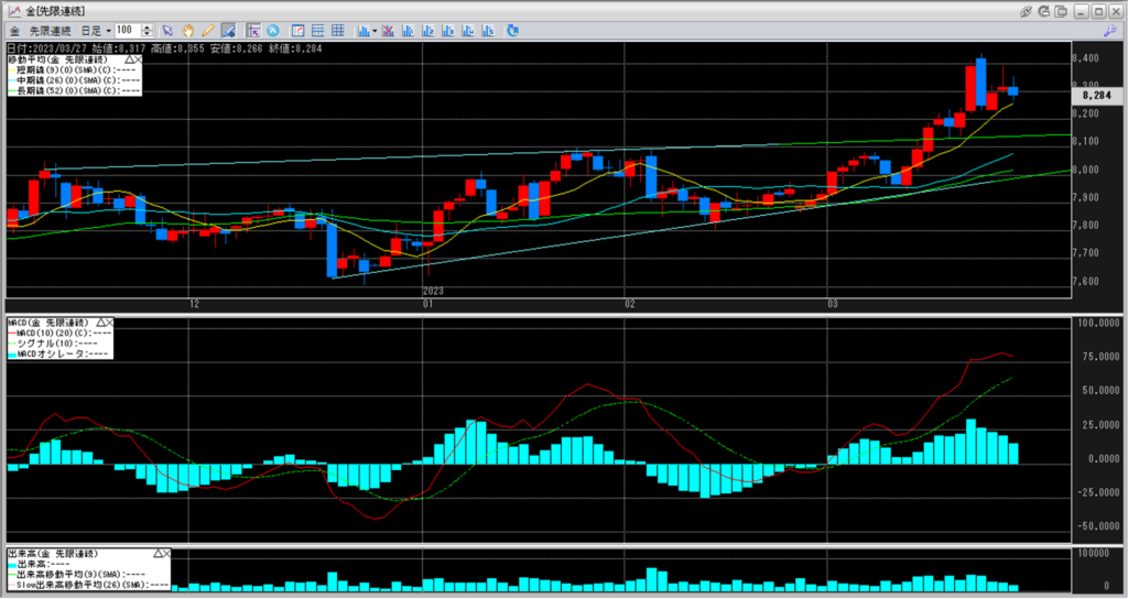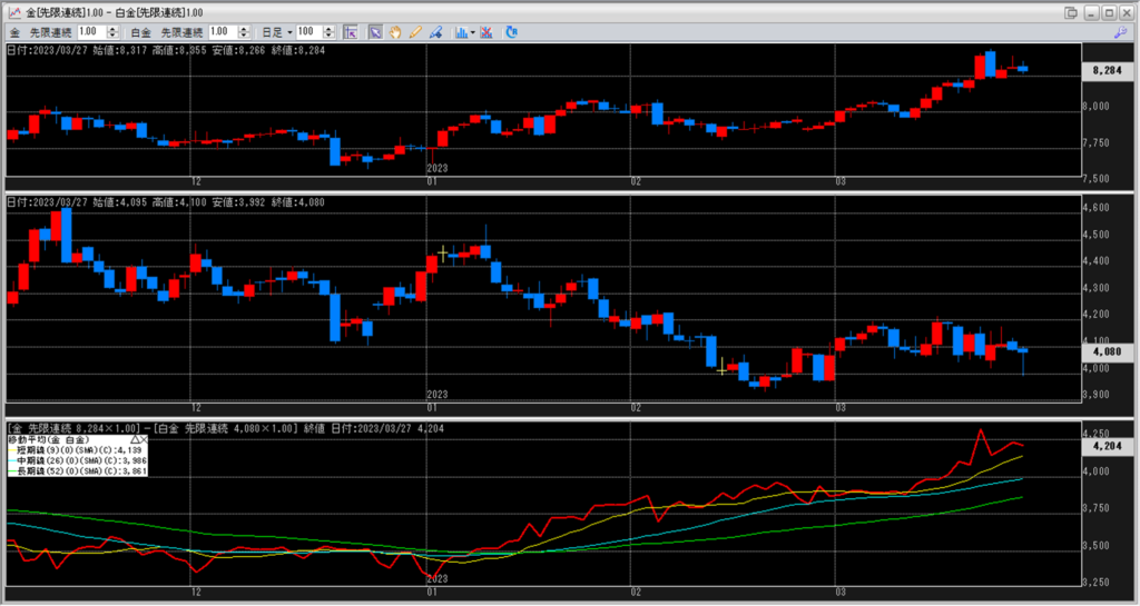 下記に金白金鞘の移動平均線のチャートを貼り付けています。