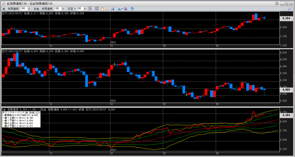 金白金の鞘をボリンジャーバンドで見ていきます。