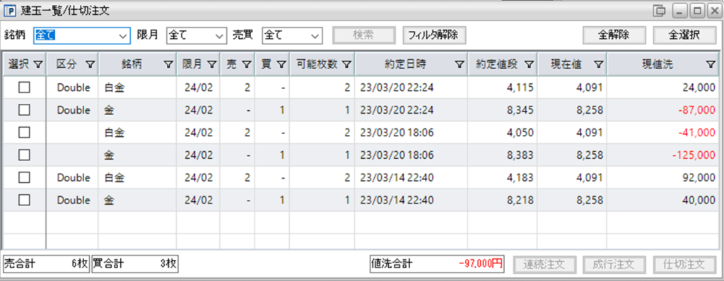 保持している鞘拡大の仕掛金買い1枚-白金売りの3組は