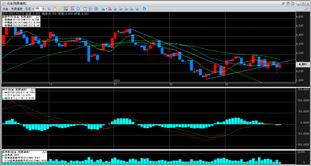 白金のチャートを見ると、4,250円から4,500円のボックス圏相場を