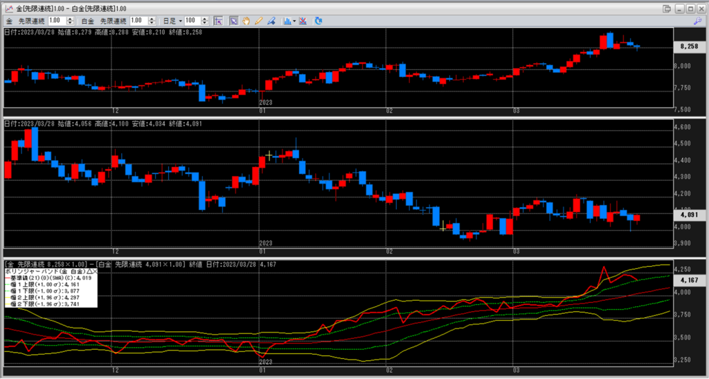 金白金の鞘をボリンジャーバンドで見ていきます。
