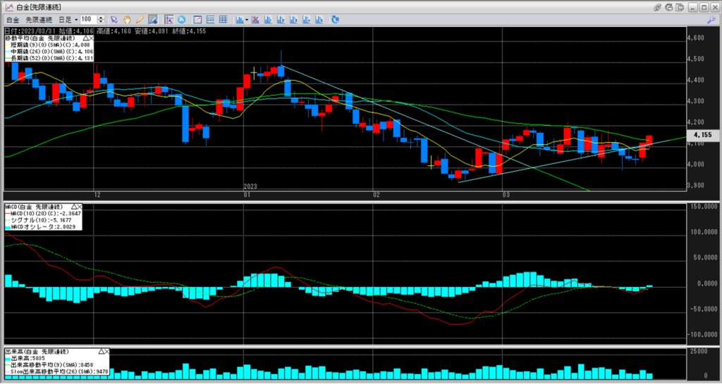 白金は、MACDがゴールデンクロスとなっており、価格を上げてきそうです。