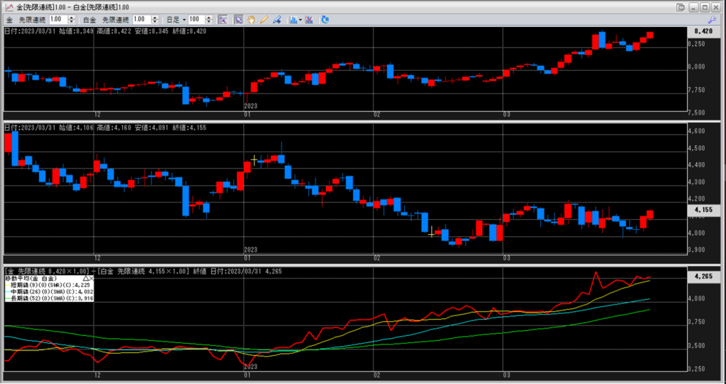 下記に金白金鞘の移動平均線のチャートを貼り付けています。