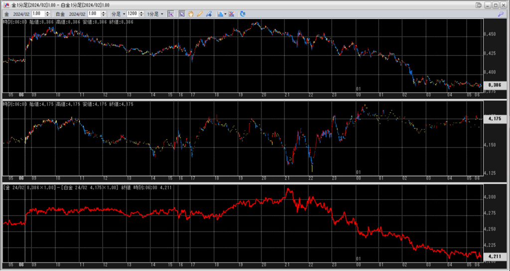 現在、鞘拡大の仕掛金買い1枚-白金売り2枚を1組、保持しています。